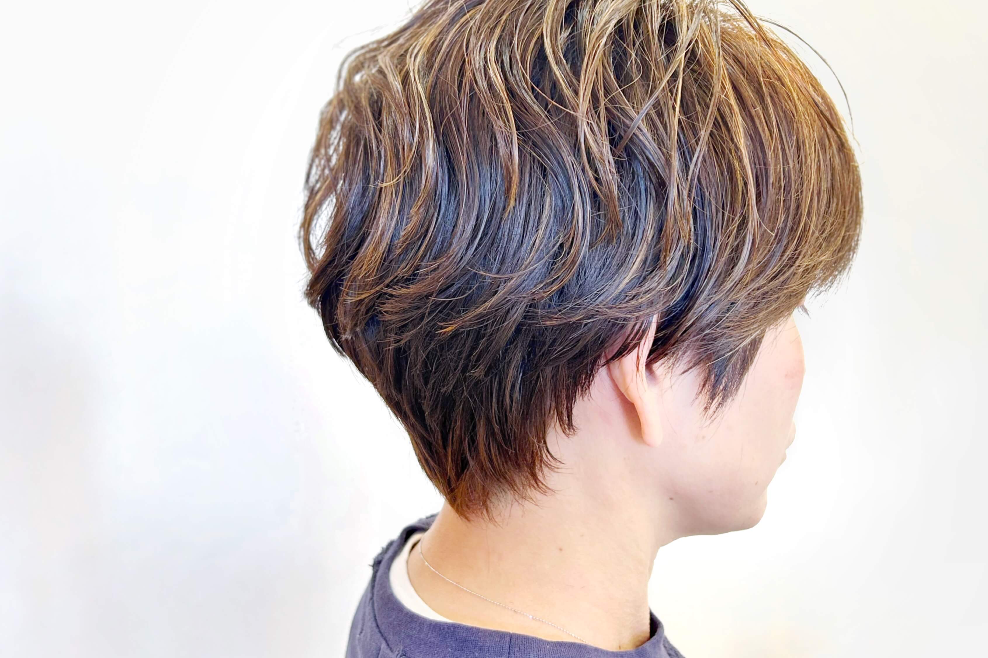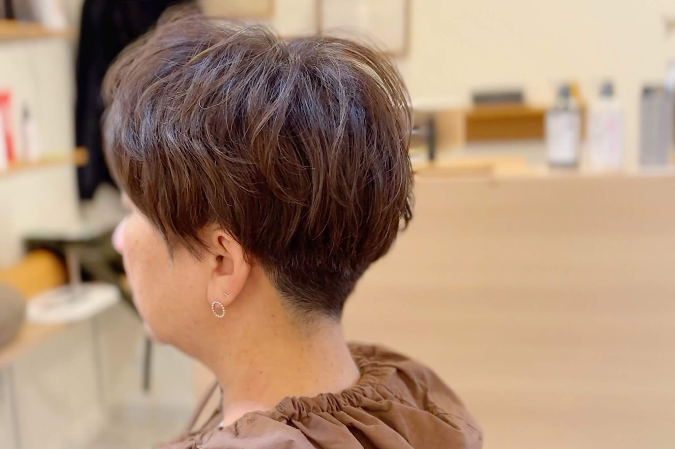 耳周りや襟足はタイトにまとまるようにしっかり短く、トップはボリュームの出やすい特徴を生かすように長さやバランスを整えることで、今まで気づかなかった「髪質が持つ魅力」を引き出しました。